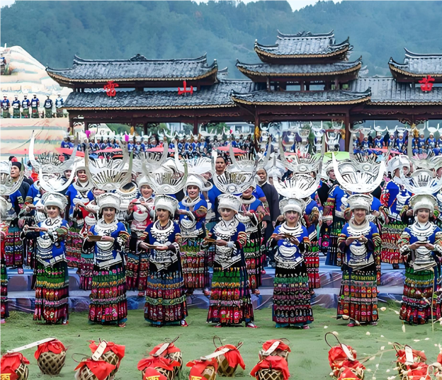苗年:貴州東南部廣西融水縣部分地區(qū)盛行“苗年”,在農(nóng)歷九、十、十一月的卯(兔)日或丑(牛)每個家庭都要準(zhǔn)備豐富的食物,女人要做新衣服,還要祭祀祖先,舉行各種娛樂活動,包括敲鼓、跳蘆笙、賽馬、斗牛、斗鳥、游方等。